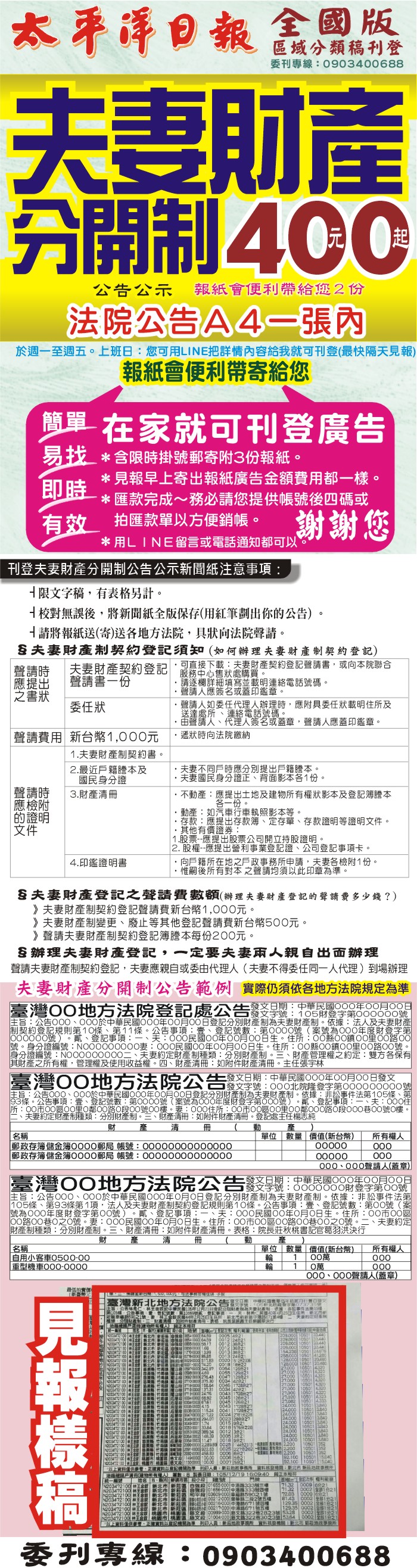 夫妻財產分開制刊登400元起(附二報紙寄出)本報價為未稅價
